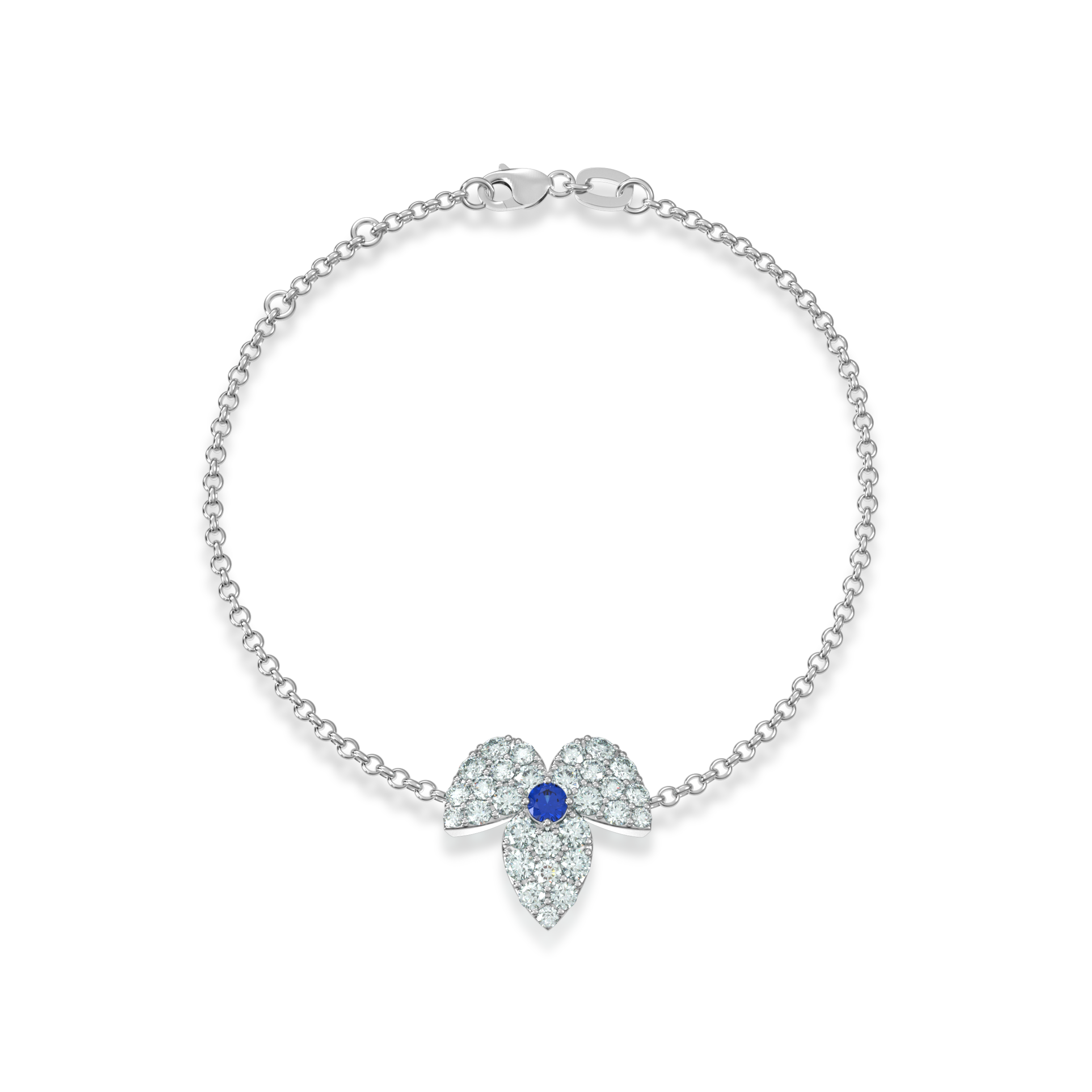 The LUNÈA diamond bracelet features a shimmering line of traceable diamonds, highlighted by a vivid blue sapphire at its center.