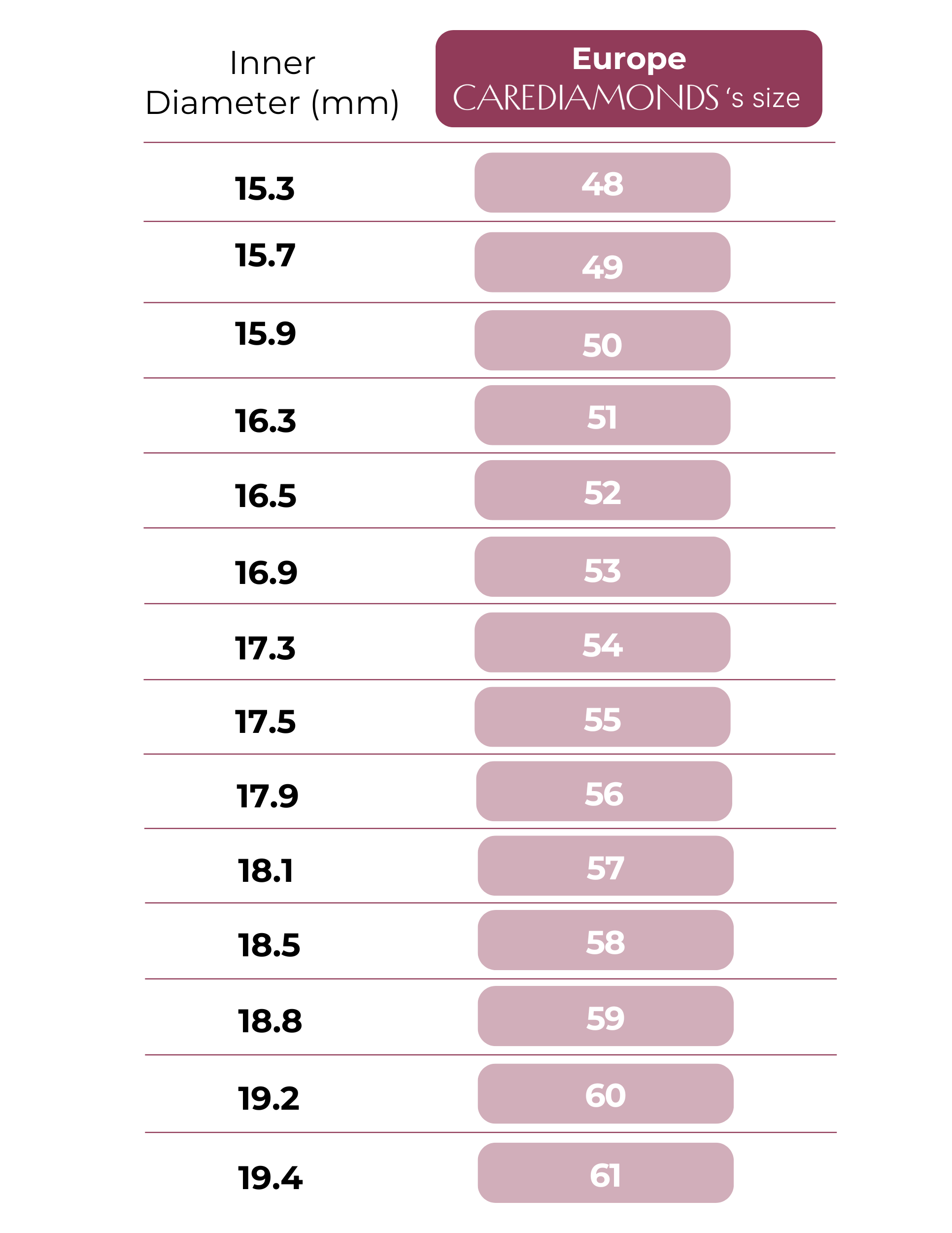 All CAREDIAMONDS rings are crafted in European standard sizes. Use this diamond ring size guide to see how sizes correspond to finger circumference.